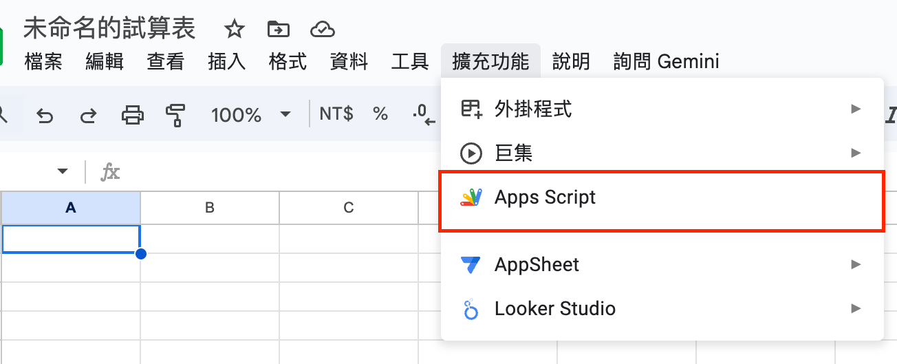 2. 在功能列表中的「擴充功能」,選擇「Apps Script」開啟腳本編輯器